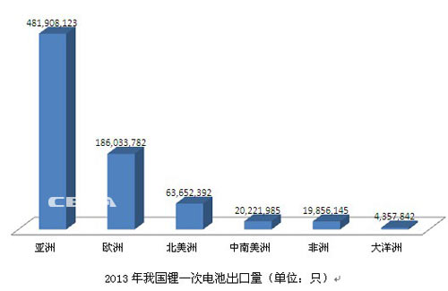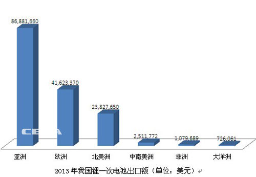 據(jù)中國化學(xué)與物理電源行業(yè)協(xié)會(huì)發(fā)布的《2013年我國電池產(chǎn)業(yè)出口數(shù)據(jù)》,2013年我國鋰一次電池出口數(shù)量為7.76億只,2012年出口量6.71億只,同比增長15.6%。2013年出口額為1.56億美元,2012年出口額1.24億美元,同比增長 25.8%。其中,我國鋰一次電池出口亞洲的金額同比增長25.4%,出口歐洲同比增長36.6%,出口北美洲同比14.4%。