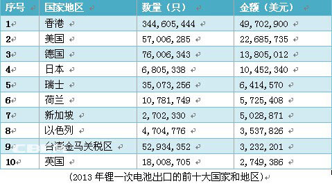 2013年,我國鋰一次電池出口的前十大國家和地區(qū)為香港、美國、德國、日本、瑞士、荷蘭、新加坡、以色列、臺(tái)澎金馬關(guān)稅區(qū)和英國。其中,向香港地區(qū)出口鋰一次電池的數(shù)量和金額均排在首位,共出口鋰一次電池344,605,444只,出口金額達(dá)到了49,702,900美元。