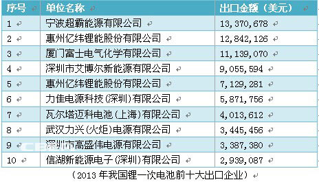 2013年,我國鋰一次電池出口排名靠前的企業(yè)有寧波超霸能源有限公司、惠州億緯鋰能股份有限公司、廈門富士電氣化學(xué)有限公司等,排名前十的鋰一次電池出口公司共計(jì)出口額達(dá)到了73,194,040美元。