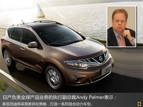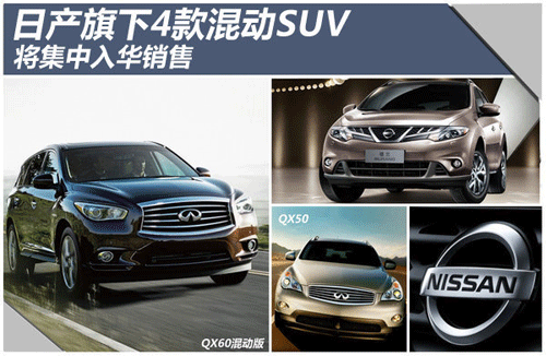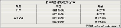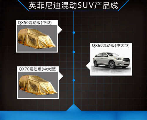 日產汽車此前計劃在2016年將推15款混動車型,該計劃將涉及到日產和英菲尼迪兩大品牌。日產負責全球產品業(yè)務的執(zhí)行副總裁Andy Palmer曾表示:為了避免同已經占領市場的歐洲豪車直接競爭,英菲尼迪將采用差異化策略,打造一系列混合動力車型,包括注重運動性能的轎車、轎跑和跨界SUV等。未來,日產旗下混動SUV車型將增至4款。英菲尼迪中國事業(yè)部總經理戴雷在接受采訪時曾表示:混合動力是我們未來發(fā)展的一大重點,會有多款使用此技術的新車型推出。除已確認的QX60混動版今年將在華上市外,其他三款SUV均有望入華銷售。