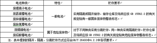 8.2.2 批量廢舊蓄電池的貯存設(shè)施應(yīng)參照GB 18597的有關(guān)要求進(jìn)行建設(shè)和管理;廢鉛酸蓄電池的儲(chǔ)存設(shè)施還應(yīng)符合GB/T 26493中4.2.3.7中的相應(yīng)要求。