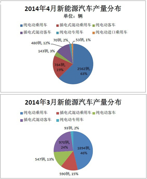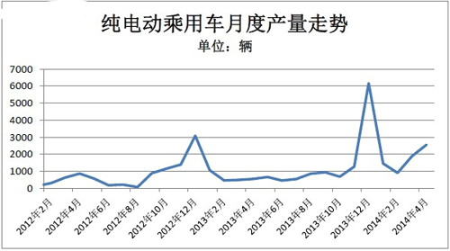 2014年4月,全國(guó)車(chē)企生產(chǎn)純電動(dòng)乘用車(chē)2562輛,環(huán)比增長(zhǎng)35.27%,同比更是高增超過(guò)3倍,增幅為359.14%。產(chǎn)量排名前三的上海華普、奇瑞、眾泰,旗下高產(chǎn)量的電動(dòng)汽車(chē)都帶有微型電動(dòng)車(chē)的基因,比亞迪、江淮等高速電動(dòng)車(chē)品牌,市場(chǎng)銷(xiāo)售還未大規(guī)模啟動(dòng)。另外,插電式混動(dòng)乘用車(chē)增長(zhǎng)較快,4月產(chǎn)出784輛,環(huán)比增加三成。