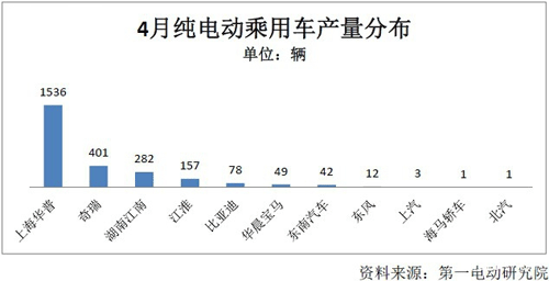 4月,產(chǎn)量排名第一的還是上海華普。自2013年12月以來,上海華普生產(chǎn)的康迪牌電動汽車開始放量。1月、2月暫歇之后,3月創(chuàng)出2511輛的紀錄。4月,1536輛康迪牌電動車產(chǎn)出,雖然不比3月,但也奪得這一品類的頭籌。(參見:中國3月純電動乘用車同比增近三倍 康迪居首)