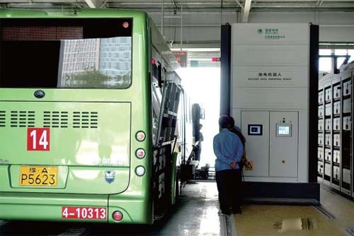 8月19日,記者在商都路汽車(chē)換電站見(jiàn)到了這種電動(dòng)公交車(chē)。這種新型純電動(dòng)公交車(chē)全長(zhǎng)12米,純綠色流線型車(chē)身,它的強(qiáng)大“心臟”由9節(jié)大容量鋰電池組成,一次充換電續(xù)駛里程可達(dá)150公里。據(jù)介紹,這批車(chē)換電池不需要人工動(dòng)手,公交車(chē)開(kāi)到換電池的車(chē)間后,只需行駛到相應(yīng)軌道,換電機(jī)器人自動(dòng)伸出“手臂”,將用過(guò)的電池取下,再將滿電的電池?fù)Q上。整個(gè)過(guò)程換電時(shí)間只需8至10分鐘,公交車(chē)就可以開(kāi)走繼續(xù)運(yùn)行了。換下來(lái)的電池,則留在充電站里充電。