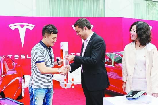 在特斯拉成都交車儀式上,特斯拉全球高級副總裁紀龍向成都車主遞交車鑰匙