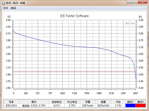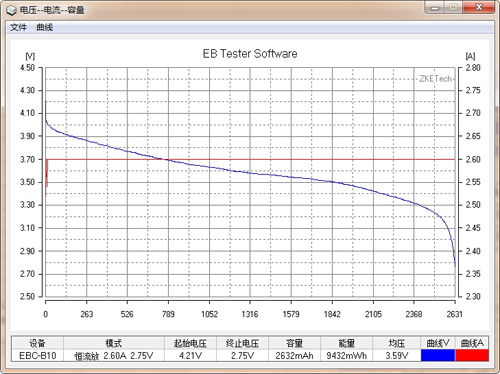 力神18650 2600mAh在室溫26度環(huán)境下經(jīng)過(guò)5小時(shí)6分鐘34秒放電至2.7V終止電壓,得出實(shí)測(cè)容量是2657mAh,能量9935mWh,平均電壓3.74V。如圖中藍(lán)色放電曲線(xiàn)標(biāo)注。