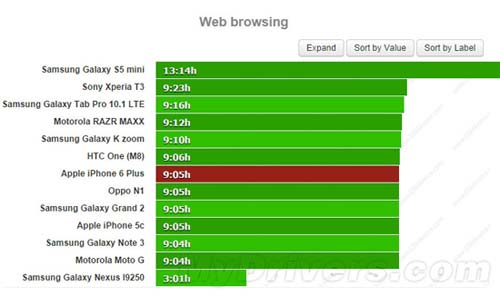 網(wǎng)頁瀏覽方面,iPhone 6 Plus能堅持9小時5分鐘,表現(xiàn)和HTC M8、iPhone 5C以及Galaxy Note 3等差不多,但并不算太高。