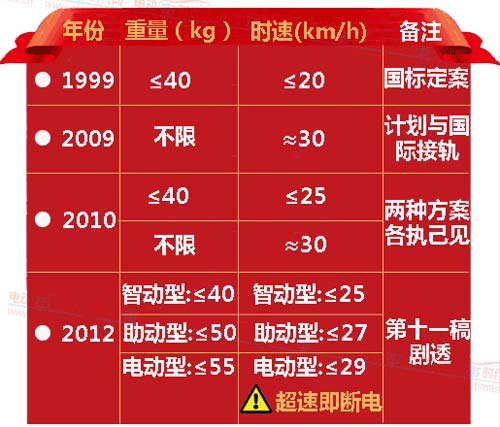 自2002年中國輕工業(yè)聯(lián)合會下達了GB17761-1999《電動自行車通用技術(shù)條件》國家標準的修訂任務(以下簡稱新電動自行車標準)以來,并要求2003年完成。迄今共經(jīng)12年新國標一直遲遲未出,但其挑逗卻從未終止過,其中,關(guān)于新國標中里程時速的標準也是幾經(jīng)更改,如下圖所示: