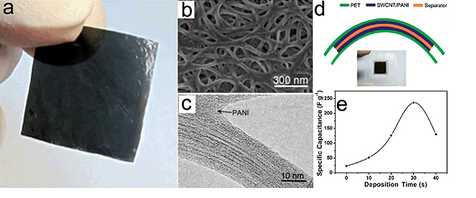 圖3 (a)超薄碳納米管/聚苯胺異質(zhì)結(jié)構(gòu)薄膜的光學(xué)照片;(b)SEM圖像和(c)TEM圖像;(d)柔性透明碳納米管超級電容器的示意圖及光學(xué)照片;(e)沉積聚苯胺不同時間碳納米管/聚苯胺薄膜超級電容器電極的質(zhì)量比電容。