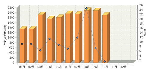 根據(jù)國家統(tǒng)計局公布數(shù)據(jù),2014年1~10月全國鉛酸蓄電池行業(yè)累計完成產(chǎn)量18,740.30萬千伏安時,同比增長10.00%。其中:10月份完成產(chǎn)量1904.61萬千伏安時,同比增長2.55%。2014年全國鉛酸蓄電池行業(yè)月度產(chǎn)量及同比如下圖所示。