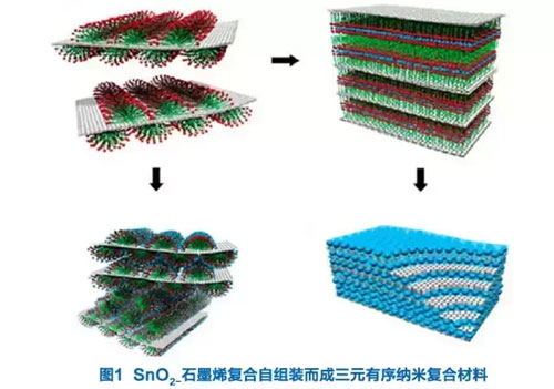 鋰離子電池方面。鋰離子電池通過鋰離子在正負兩極之間的移動來進行工作,因此電池正極材料的導(dǎo)電性能則會密切關(guān)系到鋰離子電池的能量密度和功率性能。實際上,大部分電極材料的比容量都與理論上可達到的比容量相距甚遠,尤其是在大電流充放電時,電極材料的比容量會大幅下降。石墨烯材料因具備優(yōu)異的電子導(dǎo)電性,被應(yīng)用到鋰電子電池的研究中。石墨烯層應(yīng)用于電池的正極材料中,不僅可以減少電池的界面電阻,便于鋰離子在電池的正負兩極間傳導(dǎo),還有助于減慢金屬氧化物溶解相變的速度,從而保證鋰電池的電極在電循環(huán)周期中保持結(jié)構(gòu)。有科學(xué)家采用三元共組裝法,將氧化錫與石墨烯整合在一起,與表面活性劑多元協(xié)同,制備出三元有序納米復(fù)合材料(見圖1),該材料用于電極的比容量可達到760 mA•h/g,且該材料是一種良好的緩沖材料,利于提高鋰離子電池電極材料的循環(huán)穩(wěn)定性。