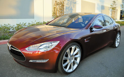 特斯拉電動(dòng)汽車車頭上方墻面懸掛了Powerwall太陽能蓄電池。(自特斯拉)