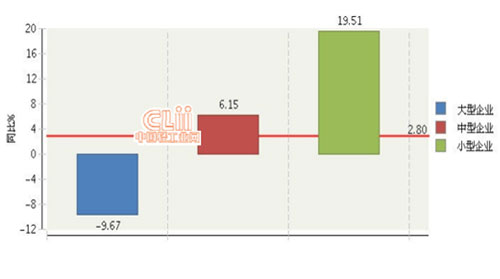 從企業(yè)規(guī)模來(lái)看,中型企業(yè)利潤(rùn)增長(zhǎng)速度最快,同比增長(zhǎng)75.12%。