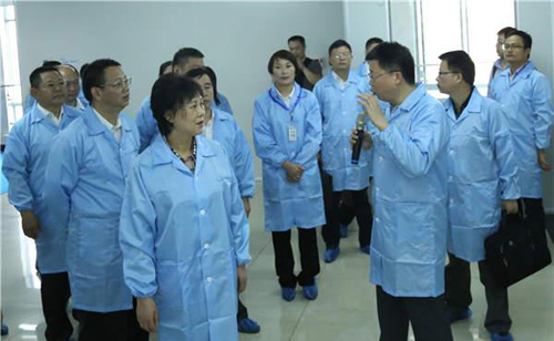 邱則有向湖南省委常委黃蘭香介紹鋰電池生產(chǎn)工藝流程