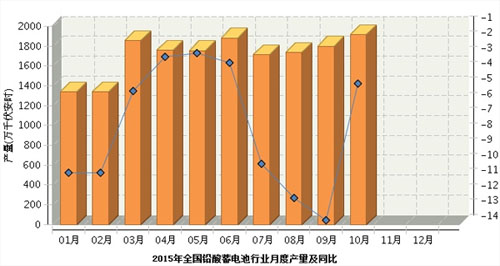 國(guó)家統(tǒng)計(jì)局最新公布的數(shù)據(jù)顯示,2015年9月中國(guó)鉛酸蓄電池產(chǎn)量為17,985,767.99千伏安時(shí),同比下降13.72%。2015年1-9月止累計(jì)中國(guó)鉛酸蓄電池產(chǎn)量150,646,332.22千伏安時(shí),同比下降10.47%。最新數(shù)據(jù)如下表所示: