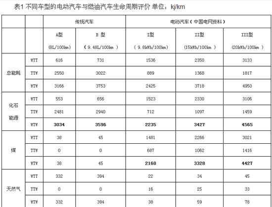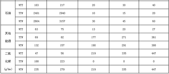 在我國2012年發(fā)電裝機和能源結(jié)構(gòu)情景下,選取三種不同耗電特性的電動汽車計算燃料生命周期評價結(jié)果,分別是9.8kWh/100km (I 型)、15kWh/100km (II 型)、20kWh/100km (III型)和兩種不同油粍特性的燃油汽車,8L/100km (A型)(中國新發(fā)布的新生產(chǎn)汽車油耗標準)和9.48L/100km (B型)。參考實際車輛的情況,認為在汽車的驅(qū)動力和舒適性等性能比較上,III型電動汽車與B型燃油汽車相近,II型電動汽車與A型燃油汽車相近,I型電動汽車與1.0L排量以下的小型燃油汽車相近。查閱中國電網(wǎng)研究院資料,采用不同能源發(fā)電方式時的能耗和二氧化碳排放對比表如下: