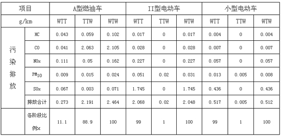 是否所有電動汽車都比燃油車更環(huán)保?汽車的生命周期評估中引入了汽車尾氣中的非甲烷烴(NMHC)、氮氧化物(NOx)、懸浮顆粒物(PM)、硫氧化物(SOx)等排放量的計算。為了便于比較,增加小型電動車的廢氣排放分析,取樣為整備質(zhì)量為400 kg的小型電動汽車,經(jīng)濟性指標目標值為5kWh/100 km。根據(jù)電力行業(yè)火電廠平均供電標準煤耗及SOx排放等指標,基本結(jié)果分析如下: