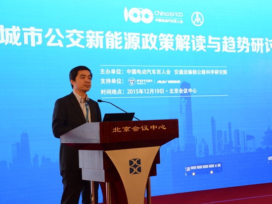 2015年12月19日,由中國電動(dòng)汽車百人會(huì)與交通運(yùn)輸部公路科學(xué)研究院聯(lián)合舉辦的“城市公交新能源政策解讀與趨勢研討會(huì)”在北京召開,國務(wù)院發(fā)展研究中心原黨組書記陳清泰、交通運(yùn)輸部運(yùn)輸服務(wù)司副司長王水平、工業(yè)和信息化部裝備工業(yè)司副巡視員瞿國春、中國道路運(yùn)輸協(xié)會(huì)城市客運(yùn)分會(huì)理事長張國光、中國電動(dòng)汽車百人會(huì)執(zhí)行副理事長歐陽明高等參加會(huì)議并講話。
