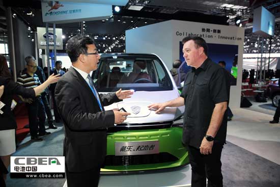 猛獅科技副總裁王亞波(左)向國外客商介紹"戴樂•起步者"純電動汽車