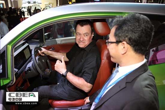 上海同捷科技股份有限公司董事長雷雨成博士(中)稱贊猛獅科技“戴樂•起步者”純電動汽車