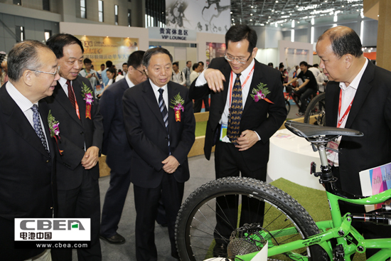 中國(guó)輕工業(yè)聯(lián)合會(huì)會(huì)長(zhǎng)步正發(fā)(左三)和中國(guó)自行車協(xié)會(huì)理事長(zhǎng)馬中超(左二)等在展臺(tái)參觀