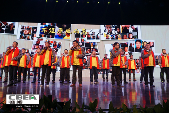 圖為超威集團(tuán)相關(guān)領(lǐng)導(dǎo)與聯(lián)營商代表共同演唱《真心英雄》