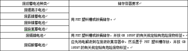 8.2.1 各類廢舊蓄電池應(yīng)根據(jù)廢電池特性采用相應(yīng)的儲(chǔ)存容器,并符合表2中規(guī)定的相關(guān)要求。且凡漏液的廢舊蓄電池必須放置在耐酸/耐堿的容器內(nèi),電池廢料可用塑料槽或鐵桶儲(chǔ)存。