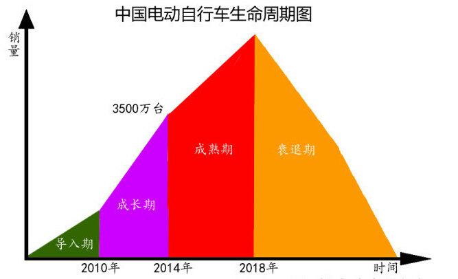 再次,拐點(diǎn)期后,電動(dòng)自行車品牌格局初定。觀察行業(yè)生命周期圖,2018年前后中國電動(dòng)自行車行業(yè)將進(jìn)入真正意義上的成熟期,品牌將大幅度減少,如上文所述,成熟期的品牌數(shù)量將大幅度減少,一線品牌陣營擴(kuò)大,一大批中小企業(yè)將不復(fù)存在。按照“二八法則”的理論。一線品牌的總銷量均將能突破200萬臺(tái)。