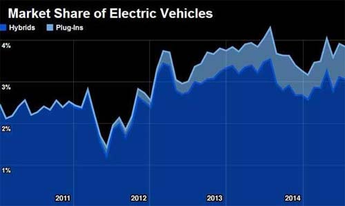 今年8月,電動(dòng)車的銷售再一次較上月出現(xiàn)下滑。市場(chǎng)對(duì)電動(dòng)車的興趣并未減弱,但是混合動(dòng)力(HYbrid)和PLUG-IN(插電式)電動(dòng)車合計(jì)僅占據(jù)汽車銷售市場(chǎng)4%的份額,表明消費(fèi)者還沒(méi)有真正開(kāi)始涌向電動(dòng)車。在上述配圖中,深藍(lán)色代表混合型汽車,淺藍(lán)色代表插電式混合動(dòng)力車。把它們合并在一起,也就是所謂的電動(dòng)車的總稱。