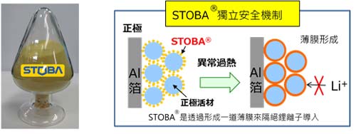 高安全電池材料 STOBA 是一種納米級樹枝狀結(jié)構(gòu)的高分子化合物,當(dāng)鋰電池發(fā)生異常,產(chǎn)生高溫時,會形成一道薄膜阻隔鋰離子間的流動,穩(wěn)定鋰電池,藉以提高電池安全度。在臺灣已有 E-bike、電動摩托車及智能手機等產(chǎn)品應(yīng)用高安全電池材料 STOBA 在其電池產(chǎn)品。