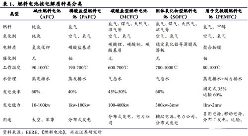 燃料電池按燃料類型可分為直接型、間接型和再生型;按電解質(zhì)種類又可分為堿性燃料電池(AFC)、磷酸鹽型燃料電池(PAFC)、熔融碳酸鹽型燃料電池(MCFC)、固體氧化物型燃料電池(SOFC)和質(zhì)子交換膜燃料電池(PEMFC)。