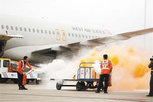 10月28日14:00左右,從上海飛來重慶的西部航空PN6230航班降落在重慶機場。當(dāng)機場地服人員把貨物從飛機腹艙裝卸到平板車上時,一箱行李里忽然竄出橙色“火焰”。