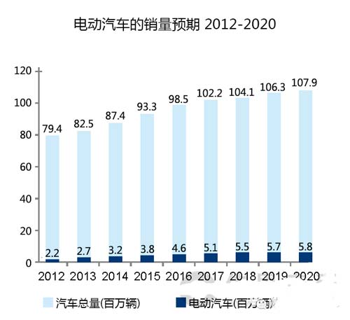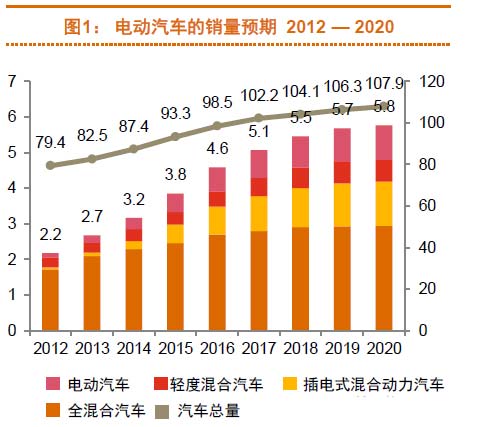 預(yù)測數(shù)據(jù)顯示,到2020年電動車(包括混合型)年產(chǎn)量將達(dá)到600萬輛,為2020年輕型車產(chǎn)量的5%-6%。