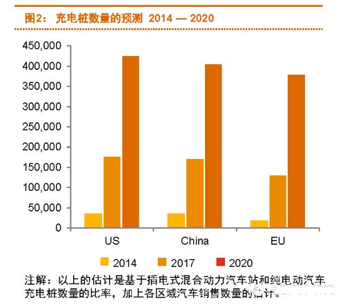 根據(jù)普華永道的預(yù)測,截至2020年,美國充電樁數(shù)量在430000根左右,中國大概會在400,000根左右,歐洲的充電樁數(shù)量會在380,000根左右。