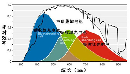 柔性非晶硅太陽能電池中嵌有三層硅晶體,粘附在不銹鋼薄膜上,外覆醋酸乙烯乙烷聚合物(EVA)保護(hù)層。三層膜粘合可減薄每個子電子層的厚度,使每個子電池的內(nèi)電場增加,增加了各子電池的收集效率,擴(kuò)展了光譜相應(yīng)范圍。每一層硅晶體都能轉(zhuǎn)換可見光譜中的特定部分,從而即使在陰雨、多云天氣中也可提供較高的光電轉(zhuǎn)換率,彌補(bǔ)了非晶硅相對于多晶硅,單晶硅板在晴好天氣轉(zhuǎn)換率低的不足(晶體硅電池轉(zhuǎn)換效率在17%左右,非晶硅電池約為8-10%,轉(zhuǎn)換效率高主要體現(xiàn)在產(chǎn)品可節(jié)省一定受光面積,而總體功率不變)。