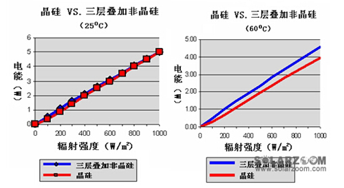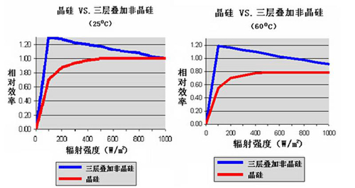 圖⑹ 25℃與60℃非晶硅與晶體硅的相對(duì)效率對(duì)比