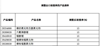 日前,財(cái)政部、國(guó)家稅務(wù)總局聯(lián)合下發(fā)通知,對(duì)部分產(chǎn)品的出口退稅率進(jìn)行調(diào)整。其中涉及的五類電池材料類產(chǎn)品,包括:鎳的氧化物及氫氧化物、六氟磷酸鋰、錳酸鋰、鋰鎳鈷錳氧化物、鎳鈷錳氫氧化物等,調(diào)整后的出口退稅率為13%。國(guó)內(nèi)相關(guān)電池材料企業(yè)將因此受益。