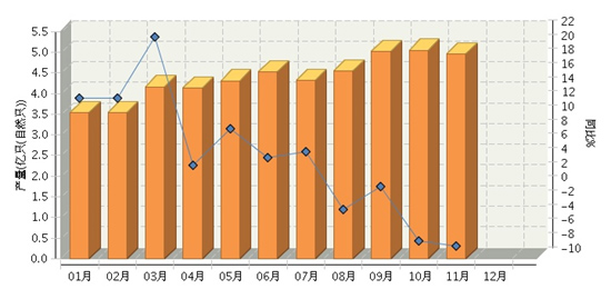 根據(jù)國(guó)家統(tǒng)計(jì)局公布數(shù)據(jù),2014年1~11月,全國(guó)鋰離子電池行業(yè)累計(jì)完成產(chǎn)量同比增長(zhǎng)2.81%。其中:11月份完成產(chǎn)量同比增長(zhǎng)-8.17%。2014年全國(guó)鋰離子電池行業(yè)月度產(chǎn)量及同比如圖所示。