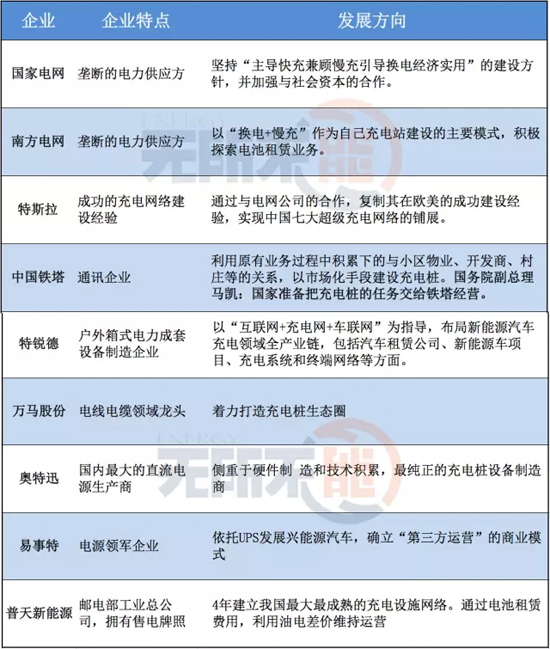 上面提到的充電市場(chǎng)商業(yè)模式只是充電企業(yè)發(fā)展情況的部分總結(jié),面對(duì)充電樁的巨大市場(chǎng),國(guó)網(wǎng),南網(wǎng)以及眾多上市公司均已加入競(jìng)爭(zhēng)隊(duì)伍,除了追求“互聯(lián)網(wǎng)+樁聯(lián)網(wǎng)+車聯(lián)網(wǎng)”的“三網(wǎng)融合”的統(tǒng)一目標(biāo),各企業(yè)也根據(jù)自身特點(diǎn),確定了自己的發(fā)展戰(zhàn)略,通過自己的方式探索充電的“藍(lán)海”。