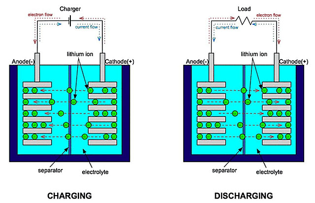 上圖非常好地顯示了電池充放電時(shí)的過程。這里先只說放電:電池內(nèi)部,金屬鋰在負(fù)極失去電子被氧化,成為鋰離子,通過電解質(zhì)向正極轉(zhuǎn)移;正極材料得到電子被還原,被正極過來的鋰離子中和。電解質(zhì)的理想作用,是運(yùn)送且僅運(yùn)送鋰離子。電池外部,電子從負(fù)極通過外界電路轉(zhuǎn)移到正極,中間進(jìn)行做功。理想情況下,電解質(zhì)應(yīng)該是好的鋰離子的載體,但絕不能是好的電子載體。因此在沒有外界電路時(shí),電子無法在電池內(nèi)部從負(fù)極轉(zhuǎn)移到正極;只有存在外界電路時(shí),電子轉(zhuǎn)移才能進(jìn)行。