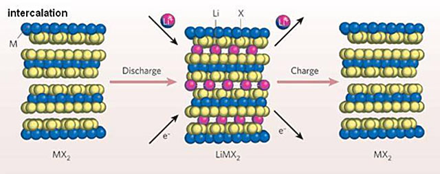 我們可以看到,MX2們?cè)谡龢O基底上形成了幾層很規(guī)整(很有序)的結(jié)構(gòu),放電時(shí),電子在正極(正極)聚集,鋰離子向正極移動(dòng),穿插進(jìn)入MX2結(jié)構(gòu)的空隙,從而有序的分布在正極表面。MX2中的金屬離子得到電子被還原,從而起到氧化劑的作用。